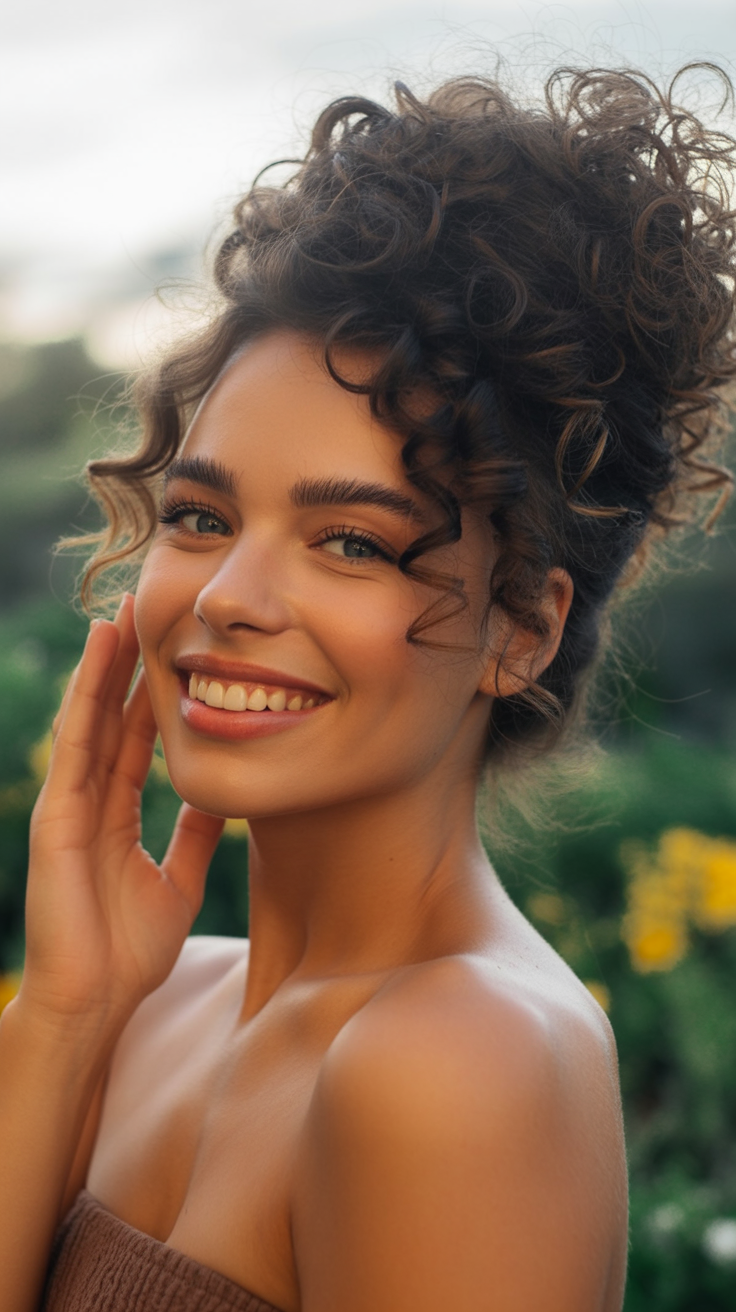 It is like poetry, this bouncy high bun where the curls are cascading down the face and at the same time the volume on top contributes a stately height to the style. It’s equal parts queen and bohemian dream, and it works whether you’re dancing barefoot at a summer wedding or heading to a chic evening out.