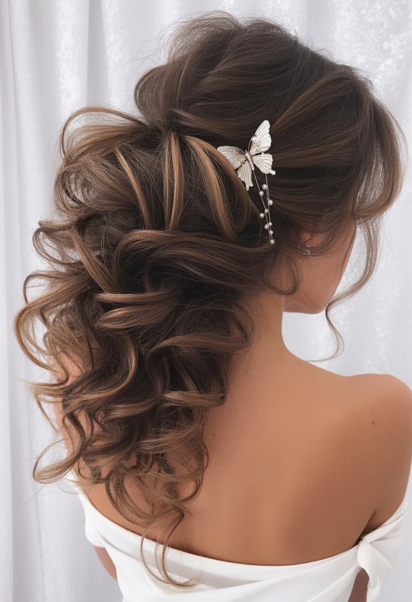 It is a low updo with curls going in all directions which is reminiscent of a fairytale moment soft curls, sweet volume and the cutest butterfly flair. It is romantic and a little whimsical and yet not too trashy to be used at weddings, garden parties, or any event where one is determined to make it magical and memorable.