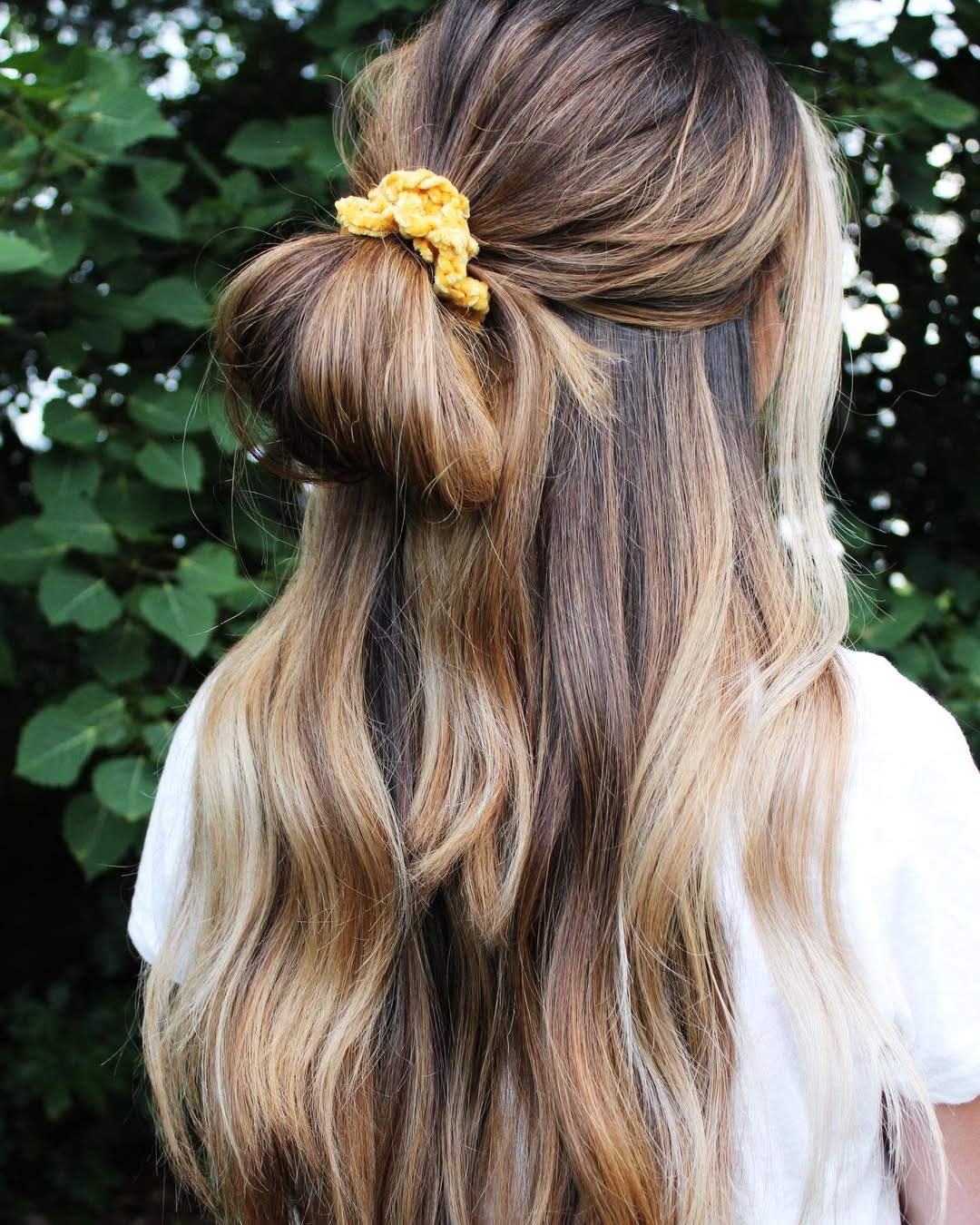 The half-up style, secured with a soft scrunchie, adds a playful, approachable element. It’s practical for everyday wear but still stylish enough for brunch or casual outings.