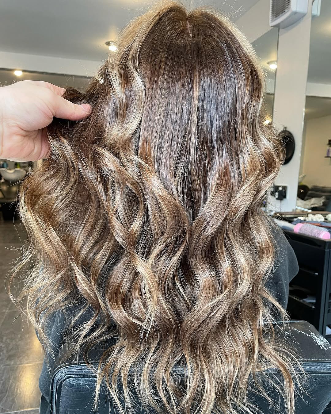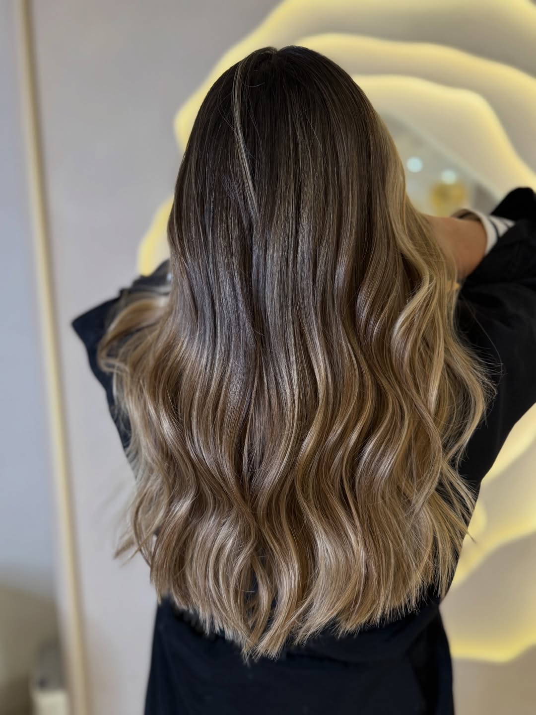 This look is a love letter to rich Brunette tones elevated by soft, ribbon-like Highlights. The finish is glossy, almost mirror-like, with waves that enhance the depth and movement of the hair.