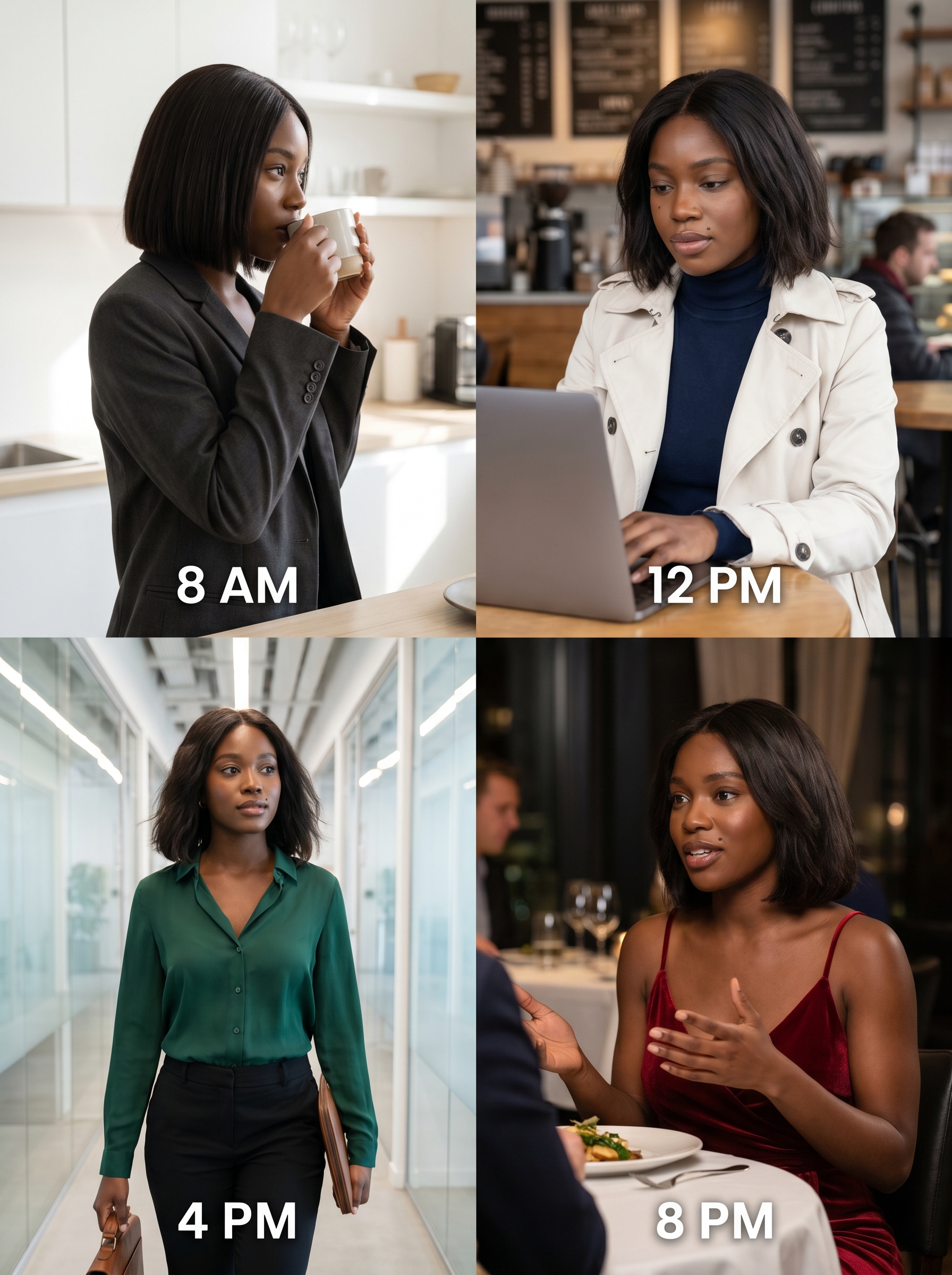 This ‘Espresso Swirl Twisted Half-Up’ is a classic choice for its sophisticated yet understated elegance, perfect for everyday wear, work meetings, or even a date night. The rich, multi-tonal ‘Midnight Espresso’ hair color in the photo showcases deep brown with cooler, subtle violet undertones, enhanced by lighter caramel highlights that catch the light beautifully. The half-up twist itself is held with a discreet pin, allowing the voluminous, soft waves of the remaining hair to cascade down; this style doesn’t just look polished but also keeps your hair comfortably contained. This complete look, designed for someone seeking a sleek, powerful, and bold aesthetic, can be achieved for a precise total of $58.69.