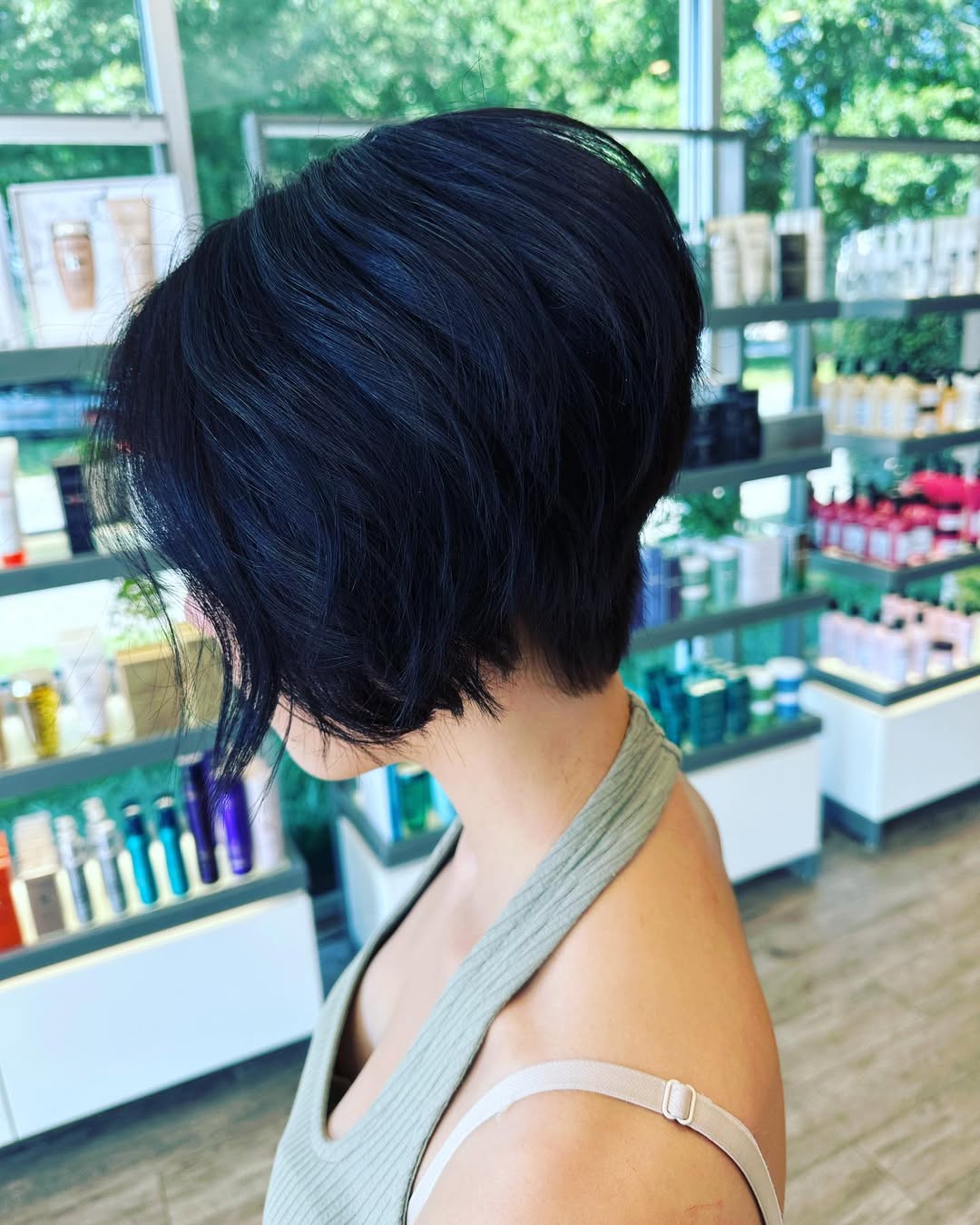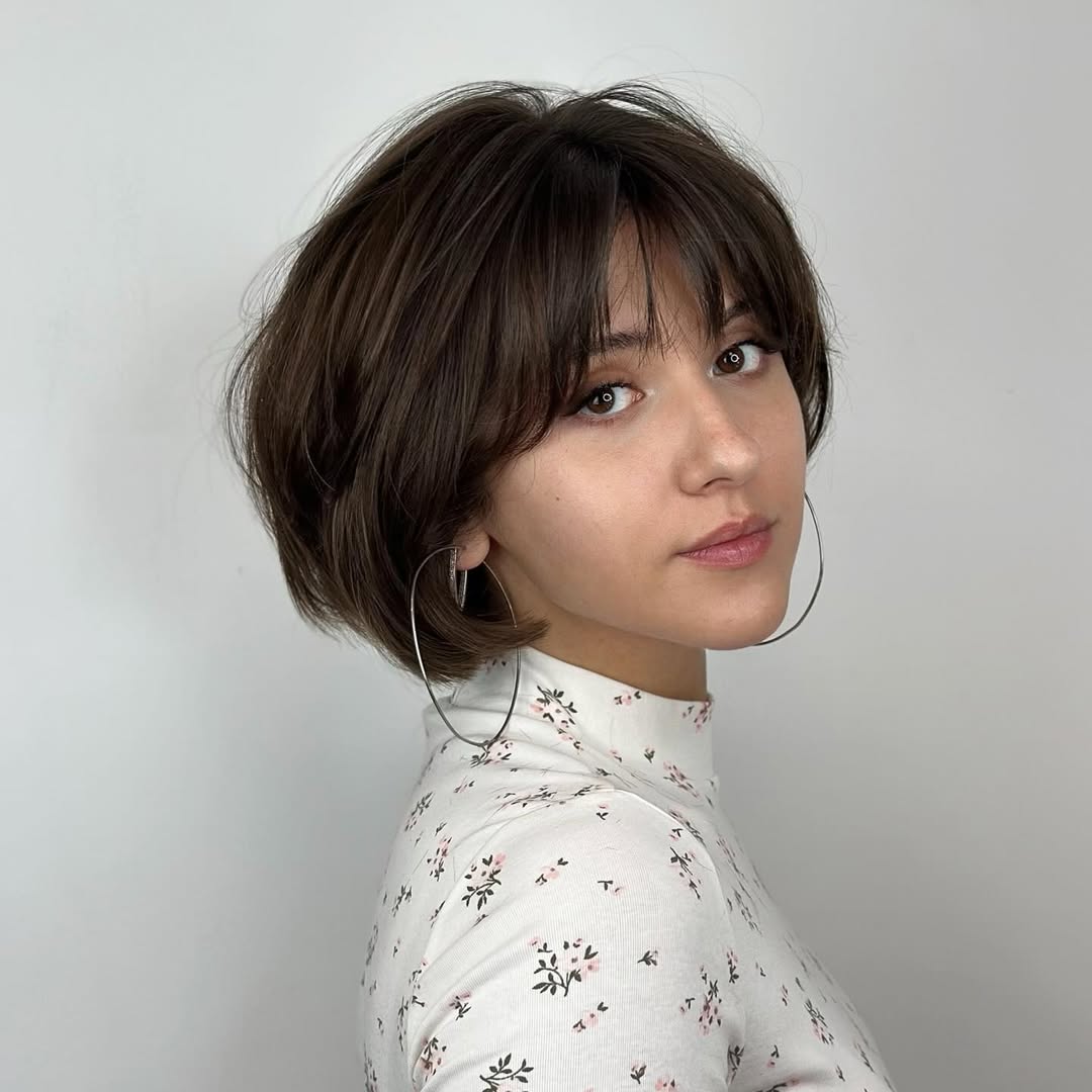 This softly layered bob introduces a playful element with airy bangs that fall just above the eyes. The deep Brunette Color enhances the softness of the cut, while the light layering keeps it from feeling heavy.