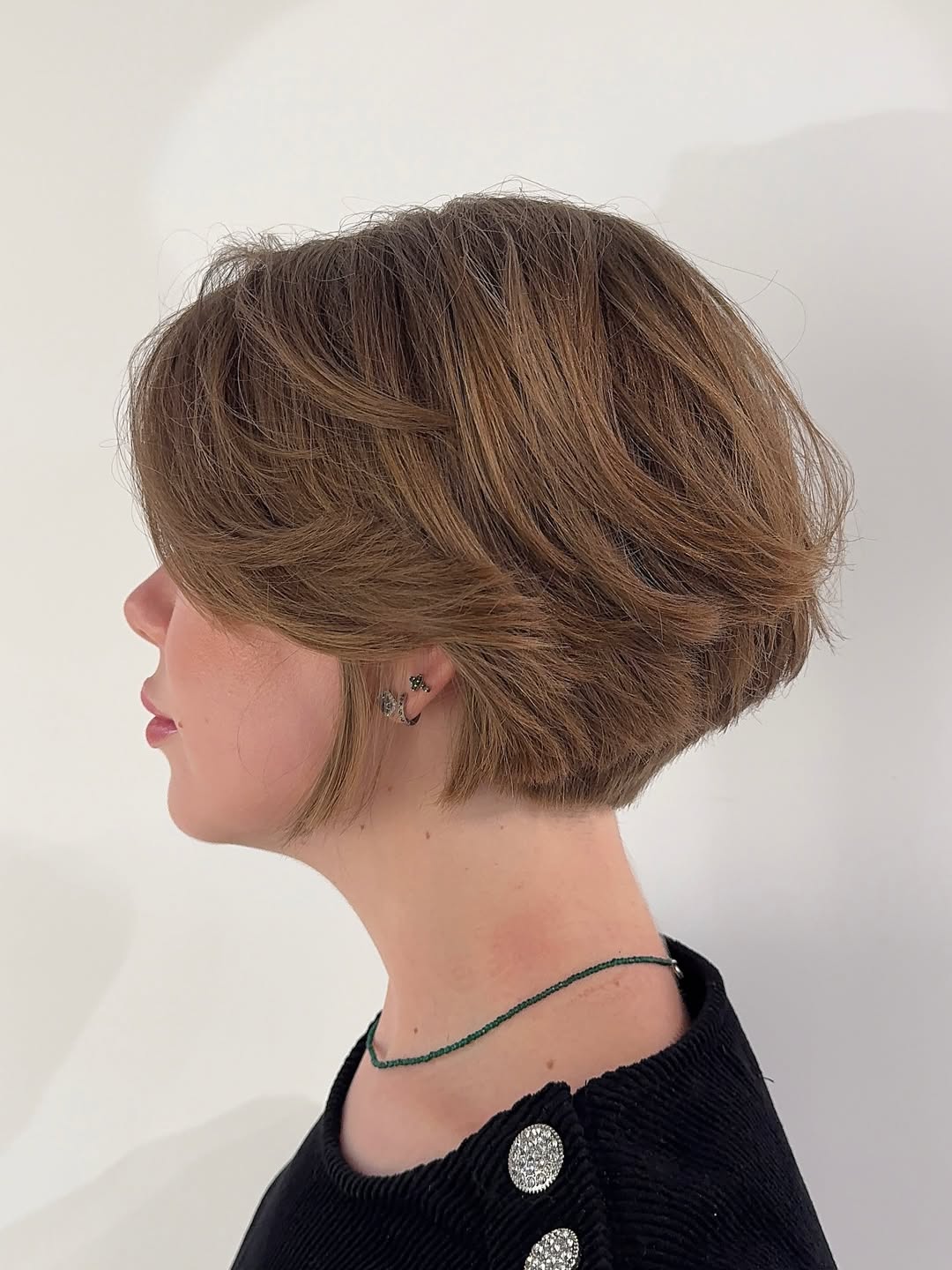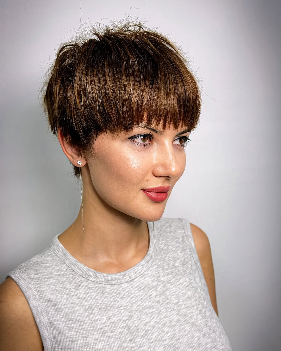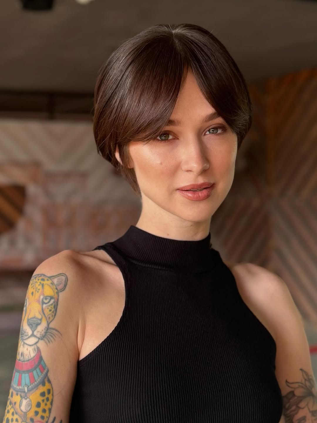 A modern pixie with a slightly longer top and delicate fringe—this is where classic meets contemporary. The warm Brown hue adds softness, making it a perfect Color for brunettes who want something natural yet elevated.
