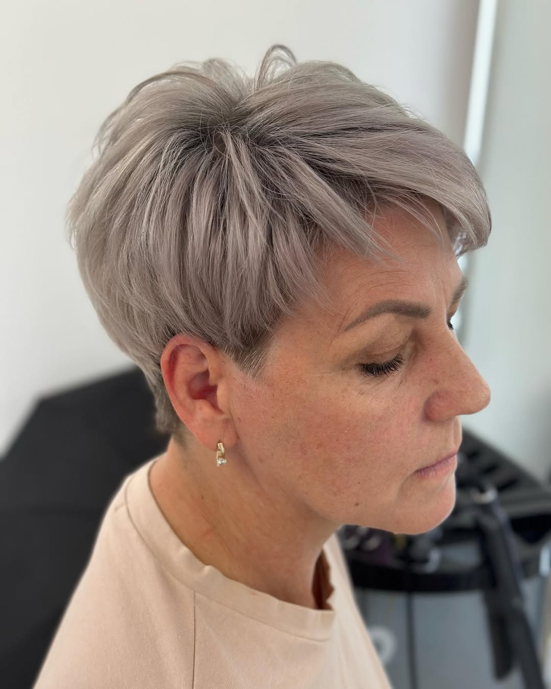Short hair doesn’t have to mean flat, and this look proves it. The silvery Blonde tone leans cool, offering a fresh take on traditional gray blending. It’s one of the most sophisticated Color ideas for women embracing natural transitions.
