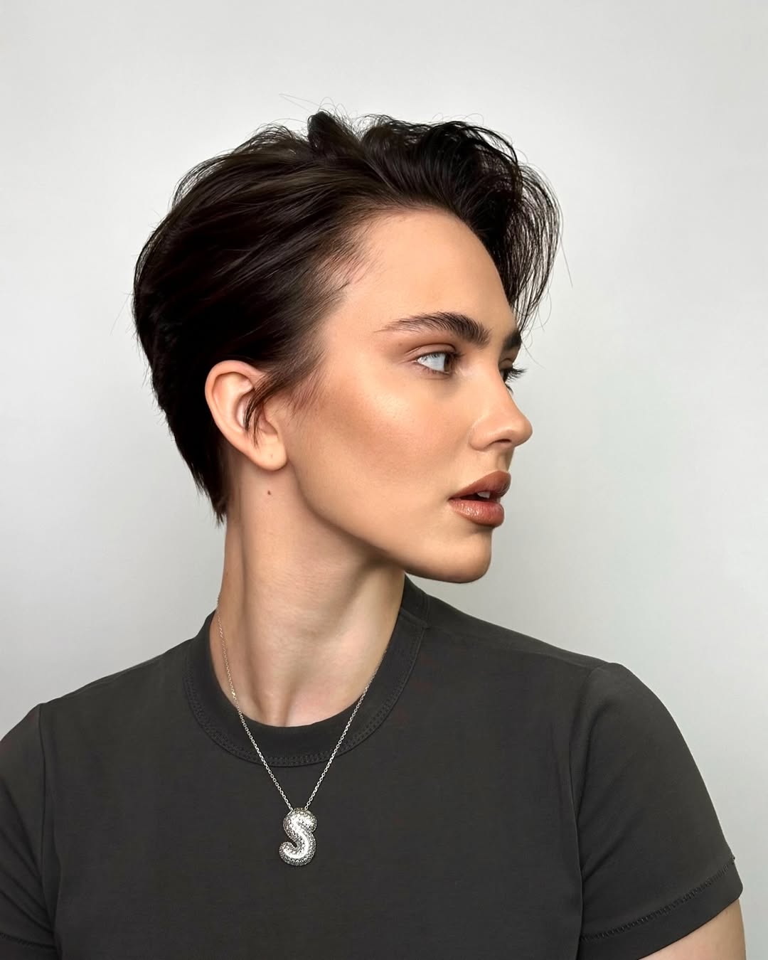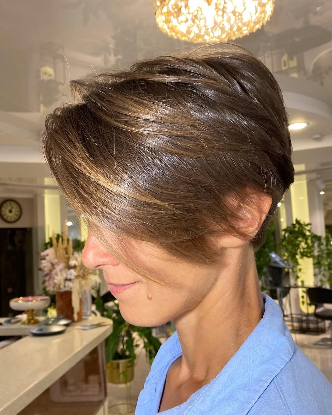 There’s a quiet sophistication to this refined Brunette pixie. The deep, glossy Brown Color leans rich and dimensional, offering a timeless take on Color for brunettes that never feels dated. The side-swept layers create a soft frame around the face, making it one of the most elegant Styles for women balancing structure with femininity.