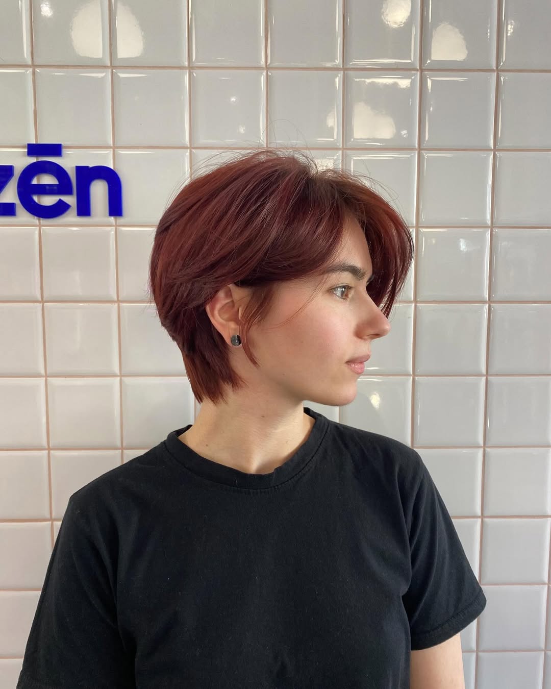 This warm-toned crop introduces a refreshing shift from classic brunettes and blondes. The auburn Color sits beautifully between Brown and red, offering a vibrant yet wearable option for those exploring new Color ideas. It’s particularly flattering on warmer skin tones and adds instant dimension to short Styles.