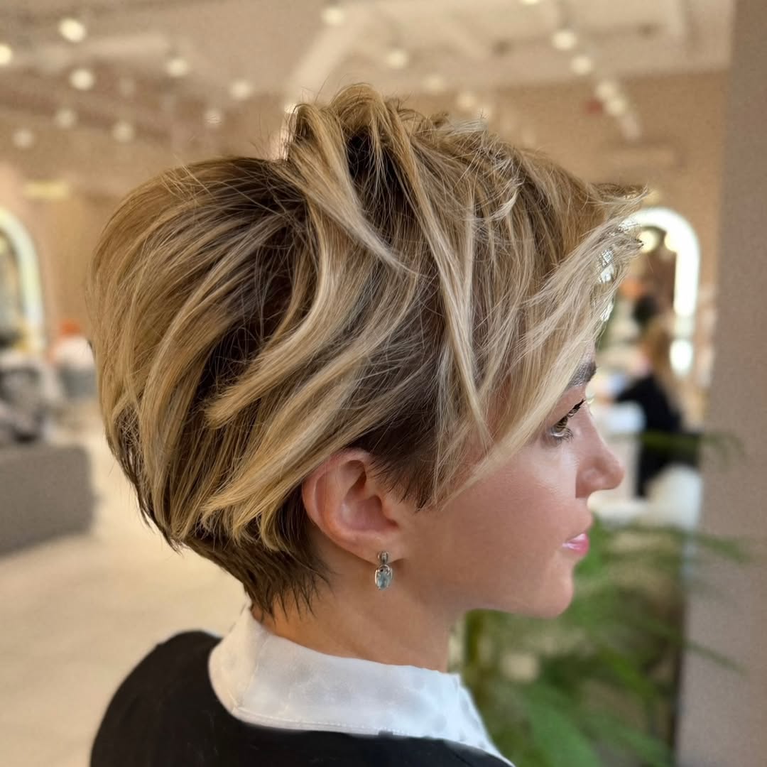 This edgy pixie plays with contrast in the best way. The bright Blonde top layers sit over a deeper Dark base, creating a bold yet wearable take on modern Color ideas. It’s a style that feels dynamic from every angle—something celebrity stylists often highlight as key for short hair in 2026.