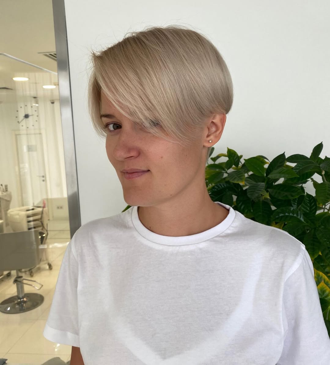 This platinum pixie leans into a bold, fashion-forward Aesthetic. The cool-toned Blonde Color creates a striking contrast against the skin, while the deep side part adds drama and sophistication.
