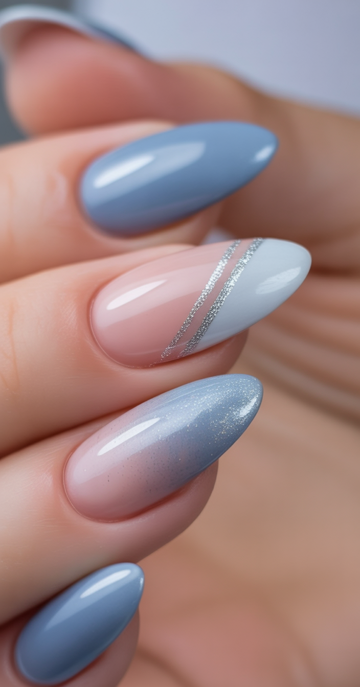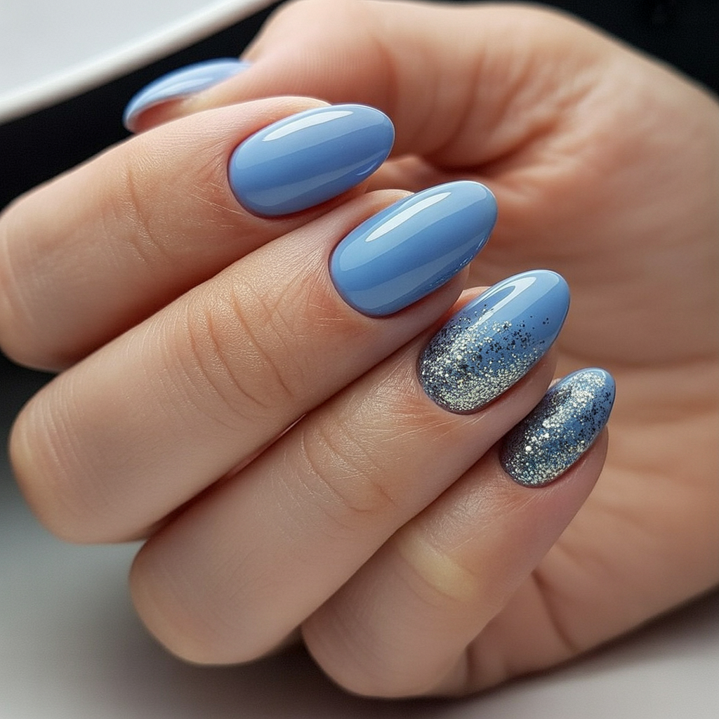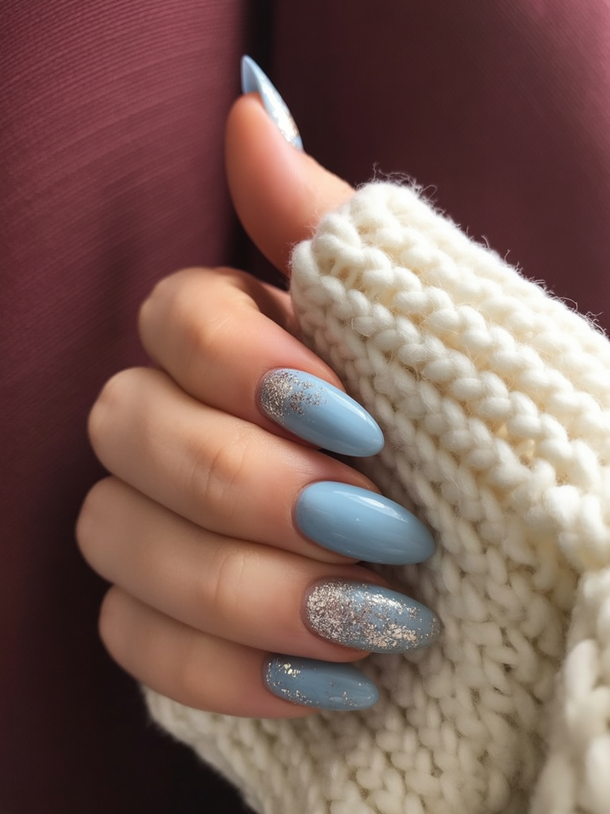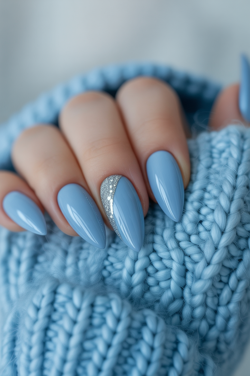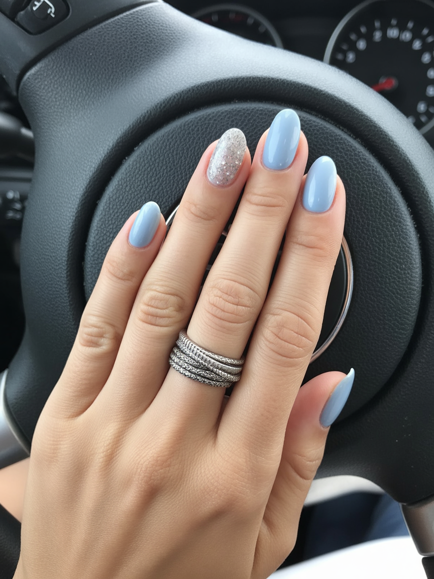 This set carries a fresh, graceful mood—almost like catching the shimmer of a frosty morning through your car window. The soft baby blue stays clean and simple, while the silver glitter accent adds the perfect pinch of personality. It’s a manicure that feels confident yet understated, cute but still grown-up, making it a lovely inspo moment for anyone craving a little sparkle with restraint.