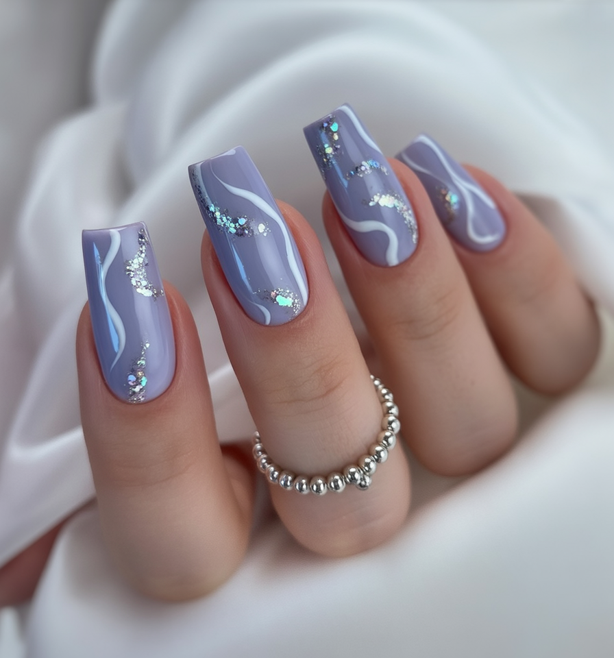 There is an artsy, softly whimsical quality about this wavy lavender blue design. The curves and shimmers convey the impression of just the hint of a gentle breeze encapsulated on nails—soft, feminine, and full of spirit. It is one design that would easily transform a basic outfit into something more fashionable because of its gentle integration of colors and motions. These design ideas are just the ticket if you are looking for something trendy without going over the top with boldness. The sparkly highlights and waves are just the right touch to give the classic design an adorable, trendy twist, which is just the ticket if you are inspired by styles that land somewhere between creativity and practicality. It looks fabulous on acrylic nails, allowing you to show off the shiny length!