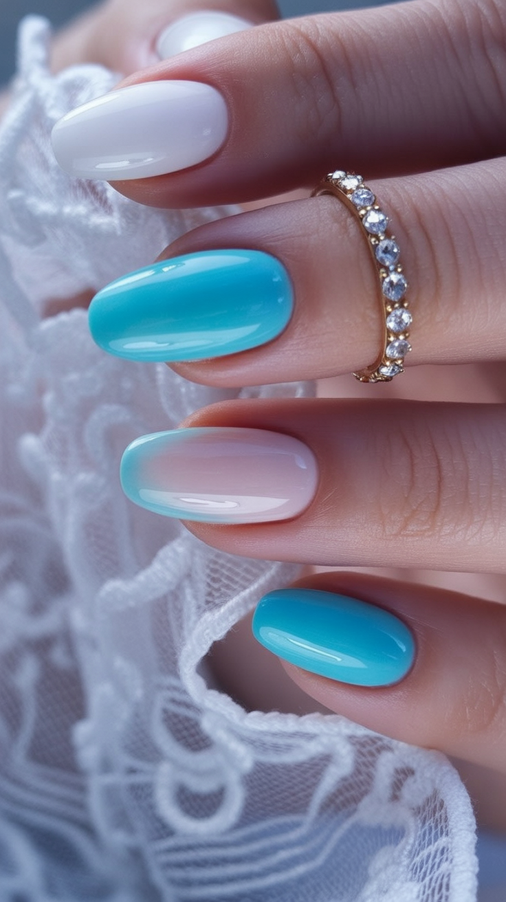 These nails bring a cheerful, vacation-ready vibe, blending crisp white with a bold wash of turquoise-blue. The gradient feels airy and fun, the kind of art that instantly puts you in a better mood. There’s a cute, youthful energy in the color mix, and the finish is so smooth it almost looks like fresh gel candy. It’s the perfect inspo for anyone wanting something bright but still elegantly blended.
