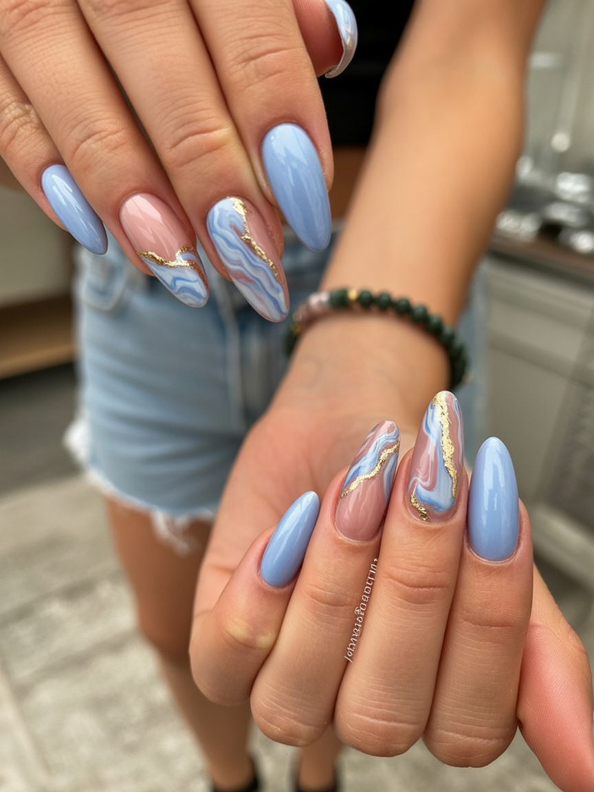 This set feels like a breath of warm summer air—soft baby blue, creamy blush, and flowing marble swirls edged with delicate gold. There’s an artistic, almost watercolor softness to it, making the whole design look like wearable art. It’s elegant, cute, and full of inspo, especially if you adore designs that tell a story without being too busy.