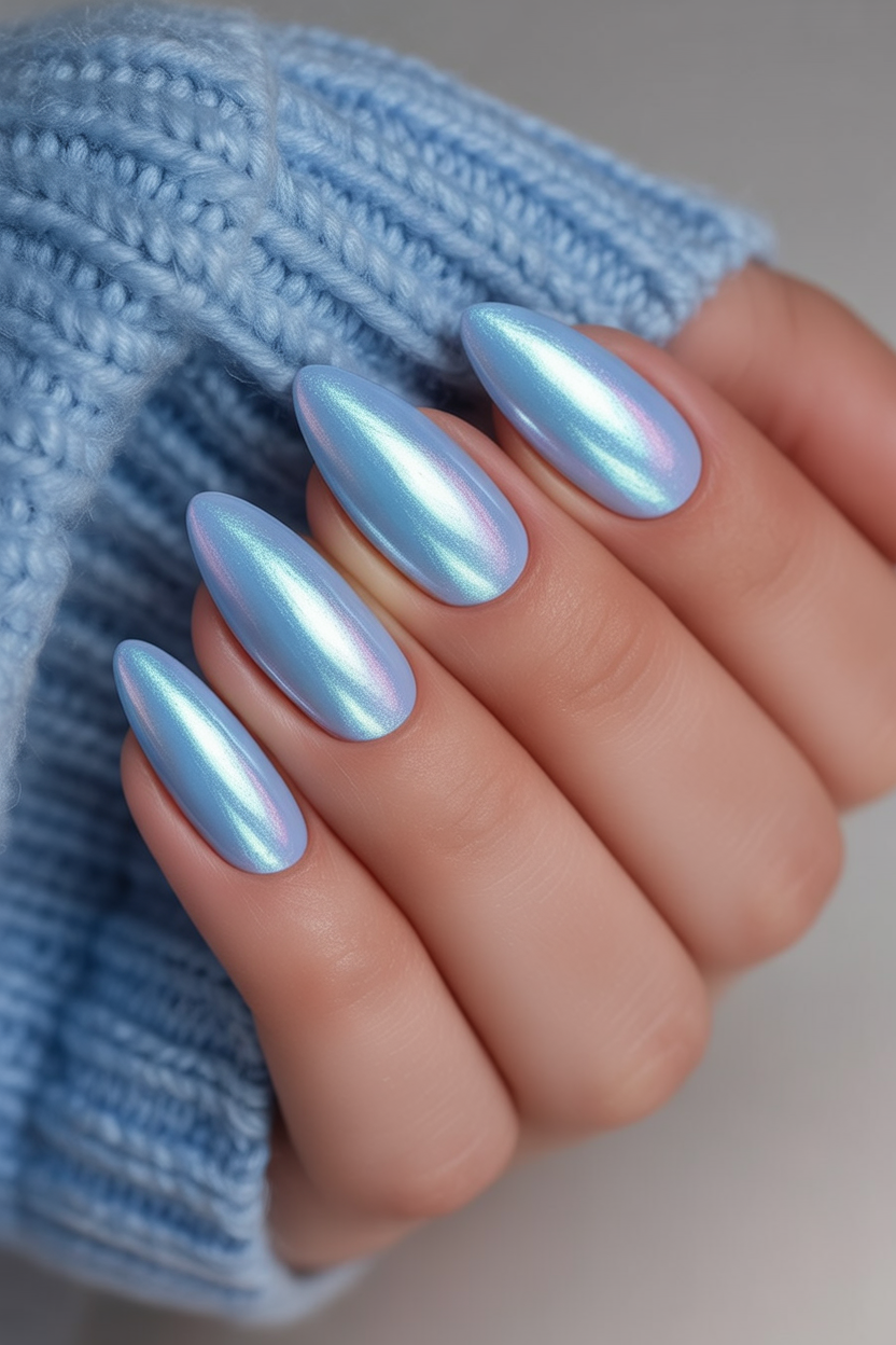 This manicure almost looks lit from within—the iridescent finish shifts softly between baby blue, pearl pink, and a touch of lavender. It’s dreamy and ethereal, like catching the shimmer of seashells along the shore. The long almond shape adds a graceful silhouette, letting the glow travel smoothly from cuticle to tip.