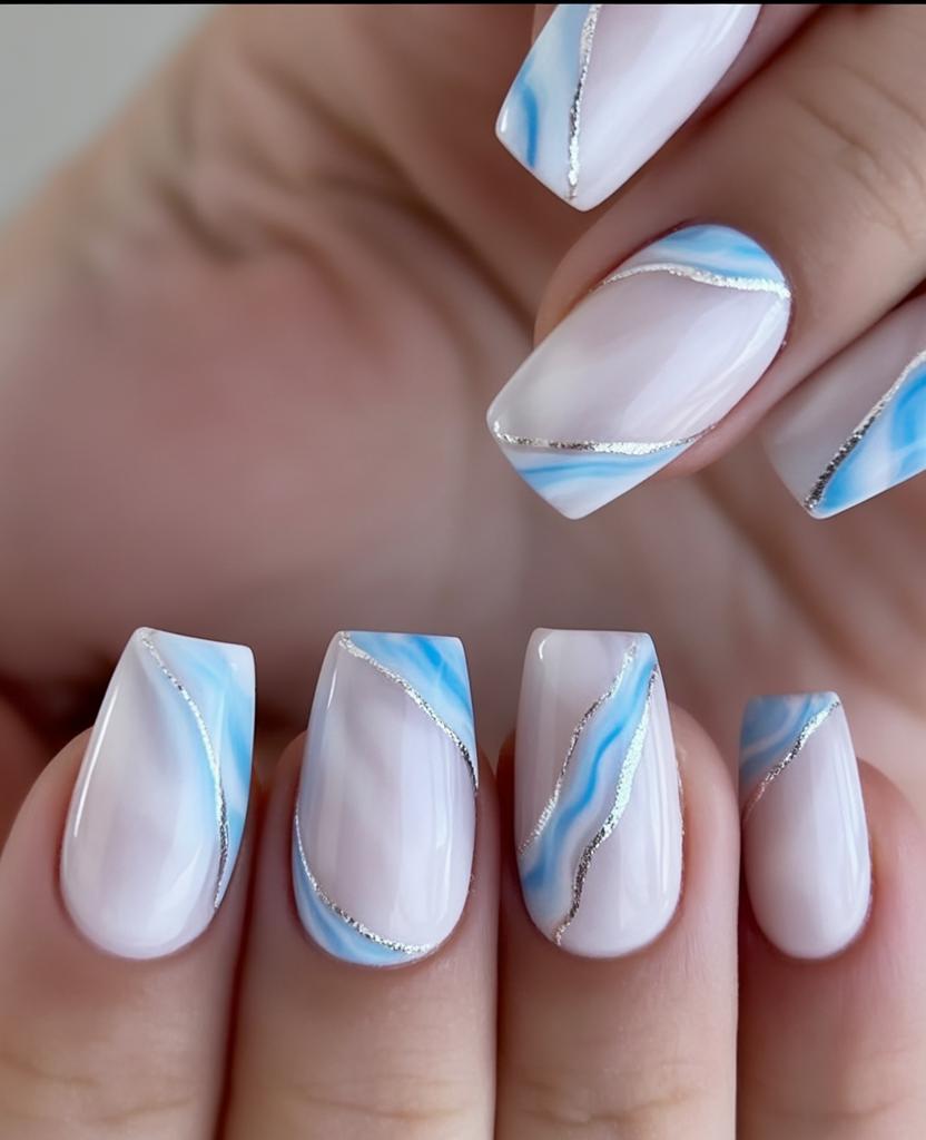 These swirling ice-blue lines feel like a modern take on classic French tip designs, offering a fresh, airy twist that’s equal parts elegant and playful. The soft marble effect catches the eye without shouting for attention, and the thin silver accents add just enough sparkle to make the whole look feel polished. It’s the kind of manicure that quietly says you appreciate artful details—the inspo you save for those moments when you want something stylish but not too loud.
