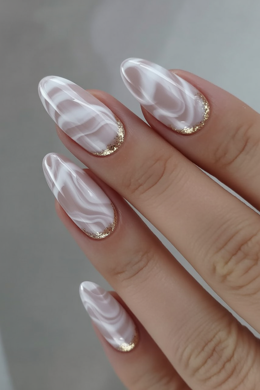 The white nails with a marble effect resemble frozen winter light streams, but swirled and touched with golden glitter at the cuticles. The design is luxurious but relaxing, as though one has entered into a snowy lodge with candlelight, and one can feel it without the explosion of sparkle but with the whisper of elegance. It is the best combination of comfort and class that would be just right on a winter evening when you need a hint of magic.