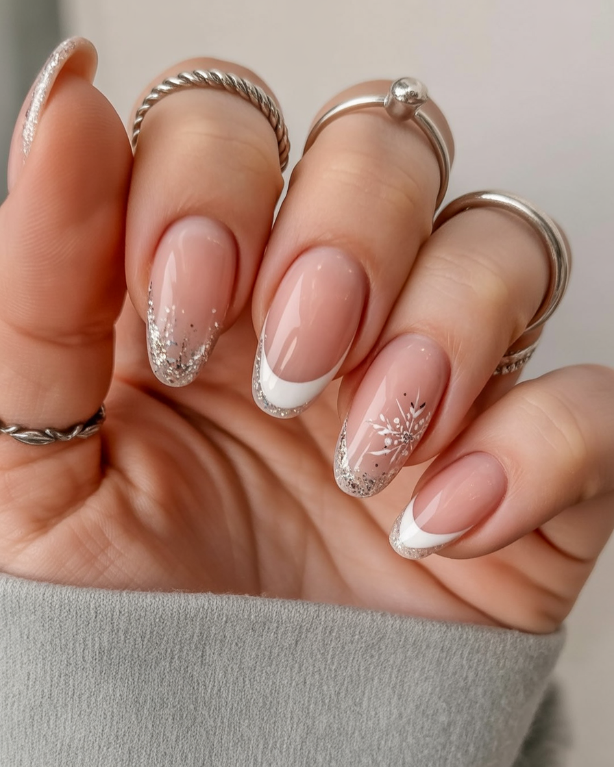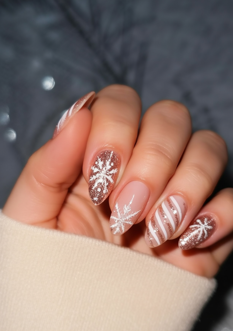 This manicure is a mixture of classic French tips and the coziness of rose gold glitter, and it gives a festive, yet elegant appearance. The alternating patterns such as full glitter nails, French accents, and glitter-frosted tips provide variety, but at the same time, everything is cohesive. It is the best illustration of how contemporary and traditional can co-exist.