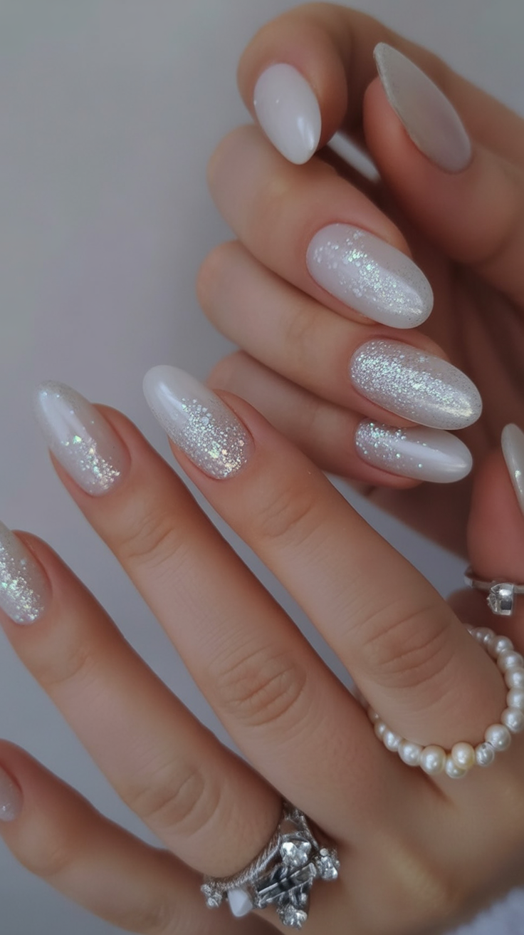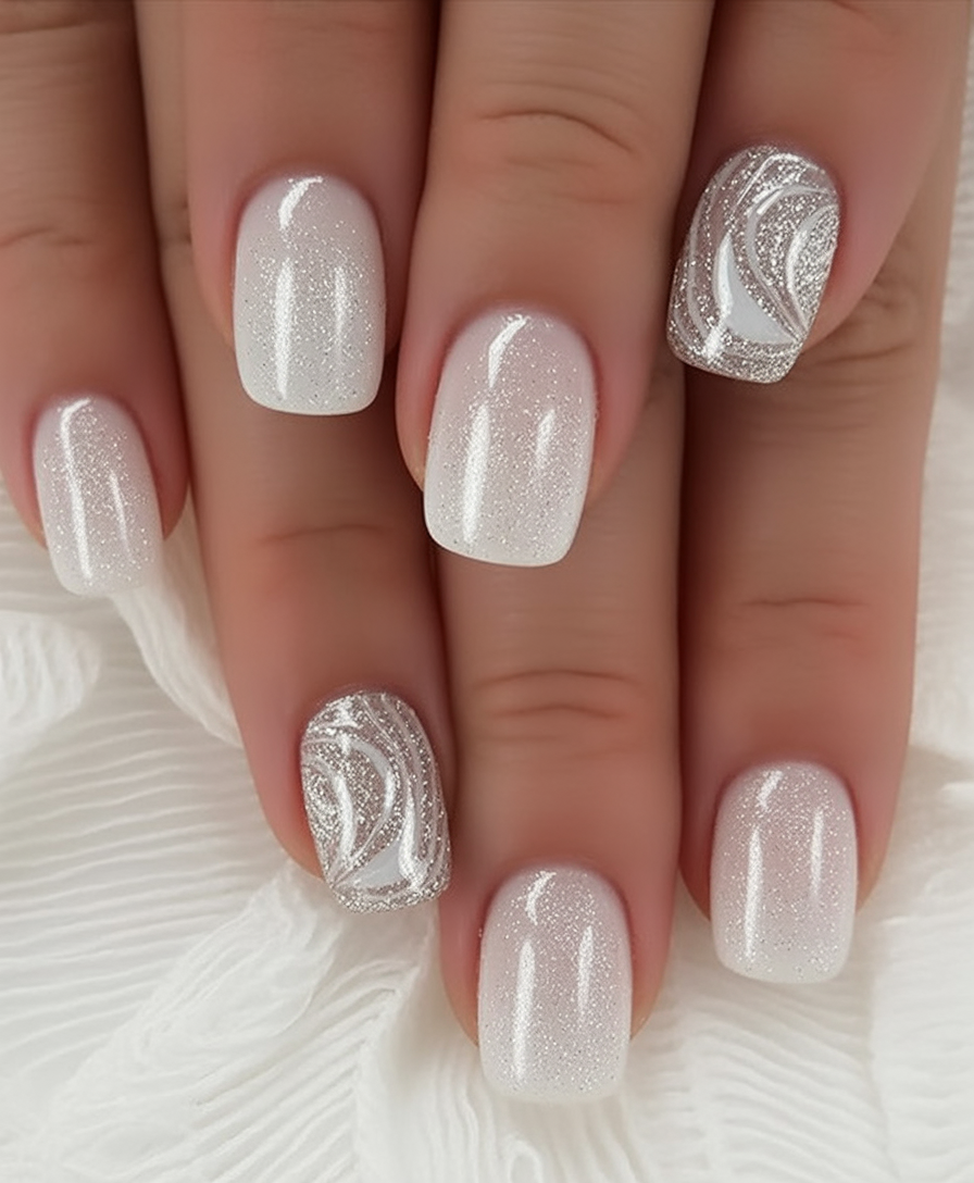 These nails are as gentle as a snowfall in the moonlight–white soft, and a sprinkling of glitter that shines like freshly fallen snow. They are light and pure and your hands touch them in a very gracious ethereal way, which is both romantic and wintry. It is a manicure that speaks in a low tone and not in a high one, and it is ideal in people who adore elegance with a touch of magic in it.