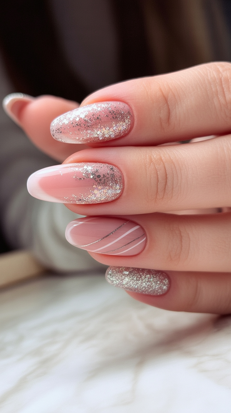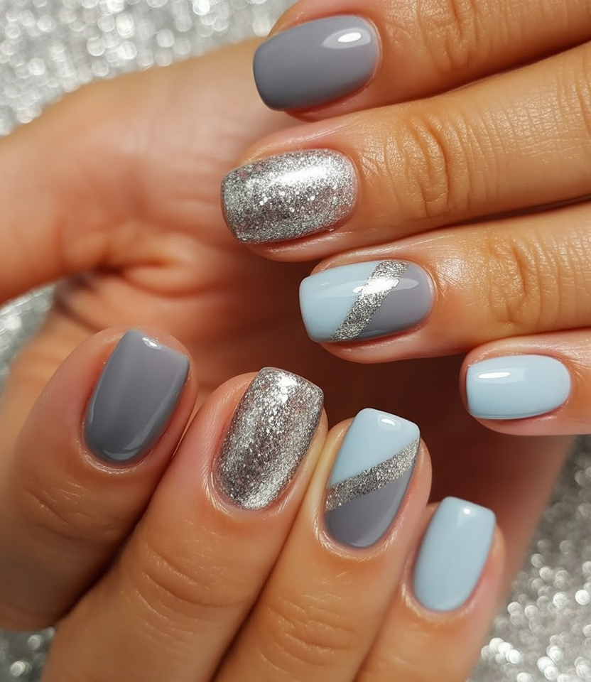 This appearance suits short square shaped nails well. The range of finishes, including solid color, glitter, and metallic stripes, adds layers, which makes it a statement style, yet not that complex. It is easy to wear on a daily basis but the silver glitter makes it have a festive touch and thus it is ideal in winter 2025.