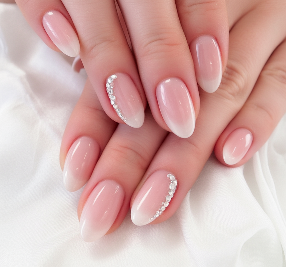 Soft blush fading to white ends gives an ombre effect which is romantic and polished with light crystal accents along the cuticle which gives it a touch of glamour. The appearance is neither too dreamy nor too fancy and thus fits well in winter weddings, special occasions or just in case you would want your nails to act as jewelry.