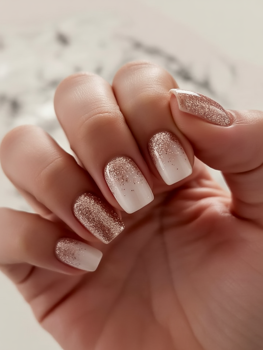 Rose gold glitter gently fading to creamy white ends is like champagne fizzing on a cold night. This appearance is a combination of both cozy and sparkle, and your nails have some modern luxury and still feel warm and feminine. It is classy without being too flashy–just enough glitz to lighten up dark winter days.