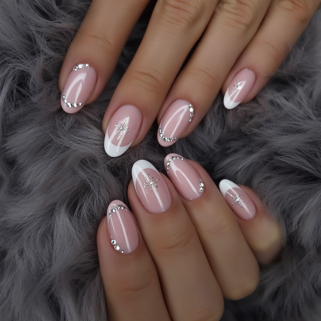 Imagine the typical French manicure, and sprinkle some soft snow on it. The nude-pink base is polished and natural with these nails and silver glitter tips and snowflake accents to give it a frosty update. It is the same as putting on a warm sweater and diamond earrings- old but admittedly glamorous. It is winter dressing on women who embrace a touch of tradition and at the same time year-round glitz.