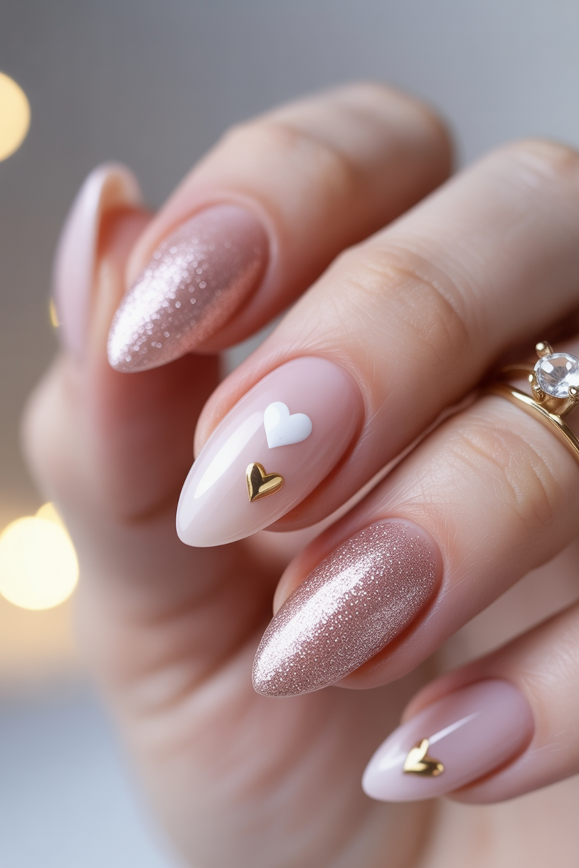 This is a manicure that is ideal to women who desire their nails to be personal and expressive. The hearts are a nice, eye-catching touch, and the glitter is soft, ensuring sophistication. The almond form is very feminine and can be worn with any casual sweater and evening dress. It is a winter style that makes one feel loved and confident.