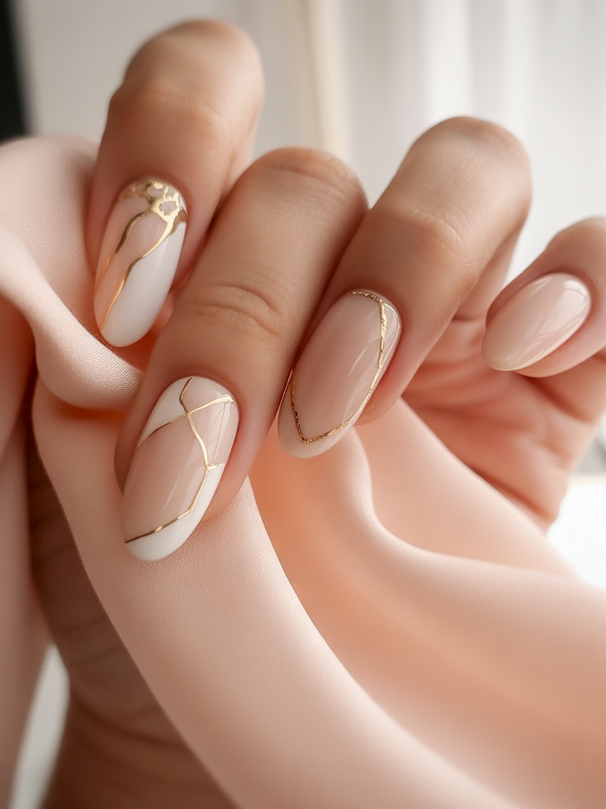 These nails are inspired by the beauty of marble and the Japanese Kintsugi art and combine soft nude and crisp white with fine golden veins. The design is like the wearable art, sophisticated, minimal, but full of personality. It is a manicure, which speaks of quiet luxury and is ideal among those women who desire something classic and yet exclusive.