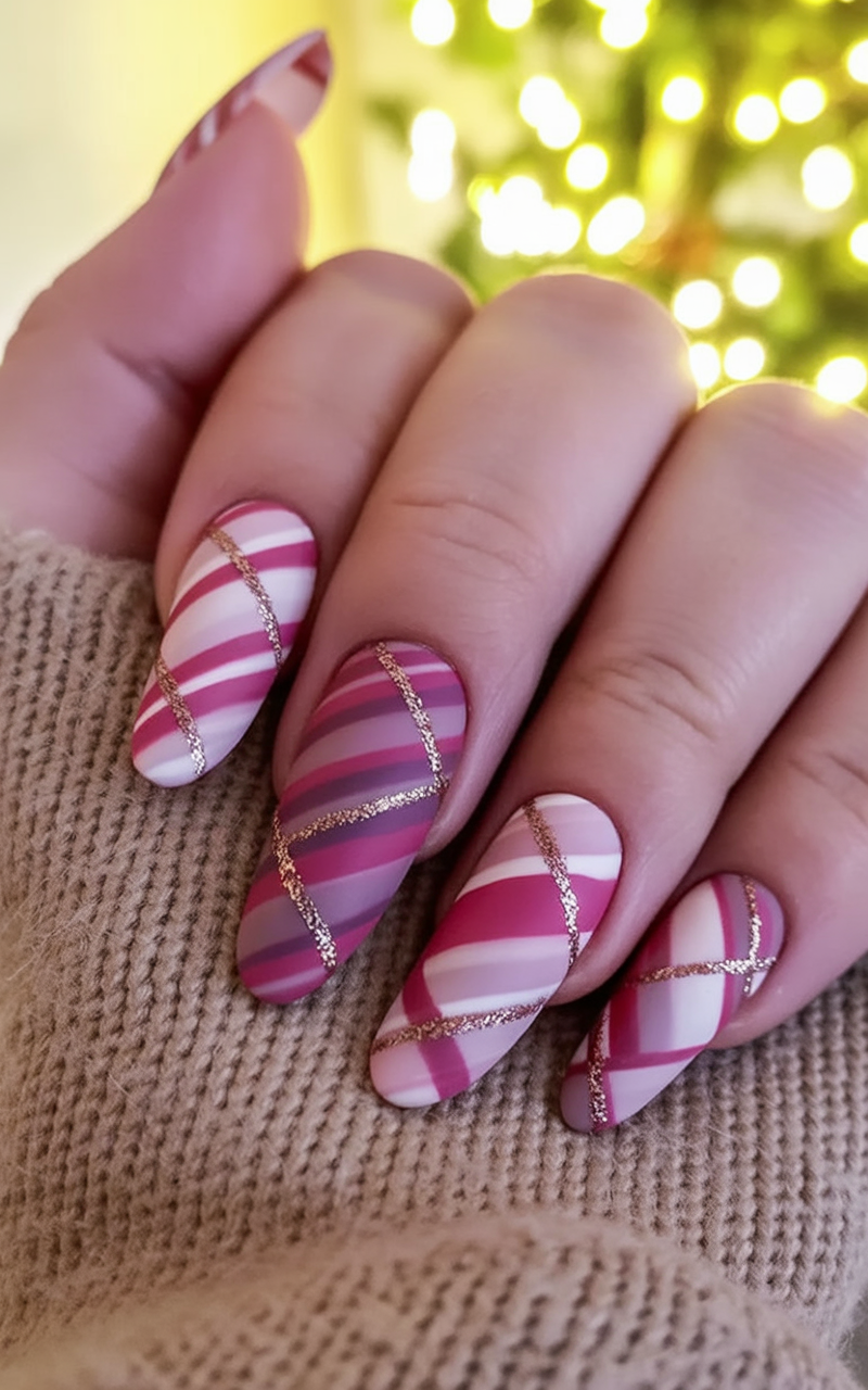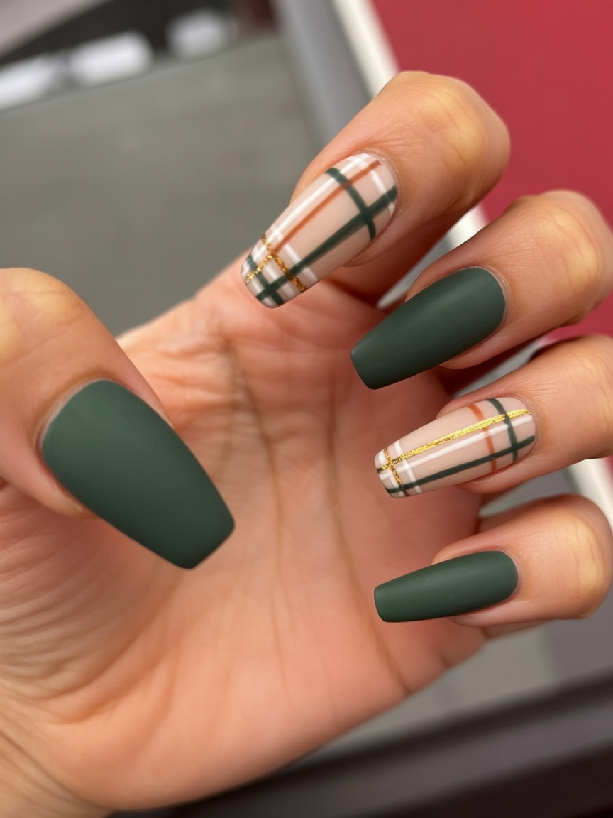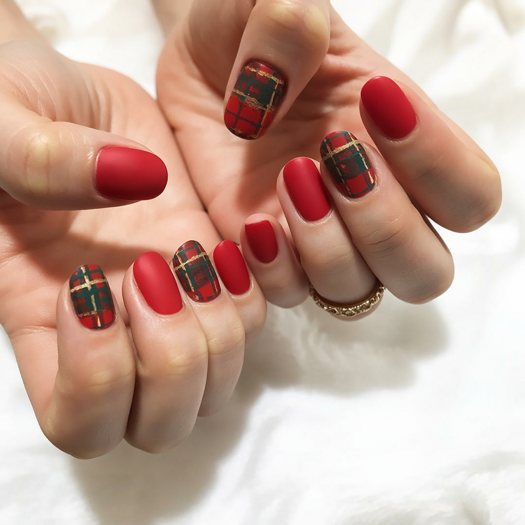 Red and green plaid with golden accents — Is there anything more Christmas-ready than this? The matte finish softens it and adds a modern touch while the plaid nails cause a stir. It creates nostalgic feelings but it is totally trendy for 2025.