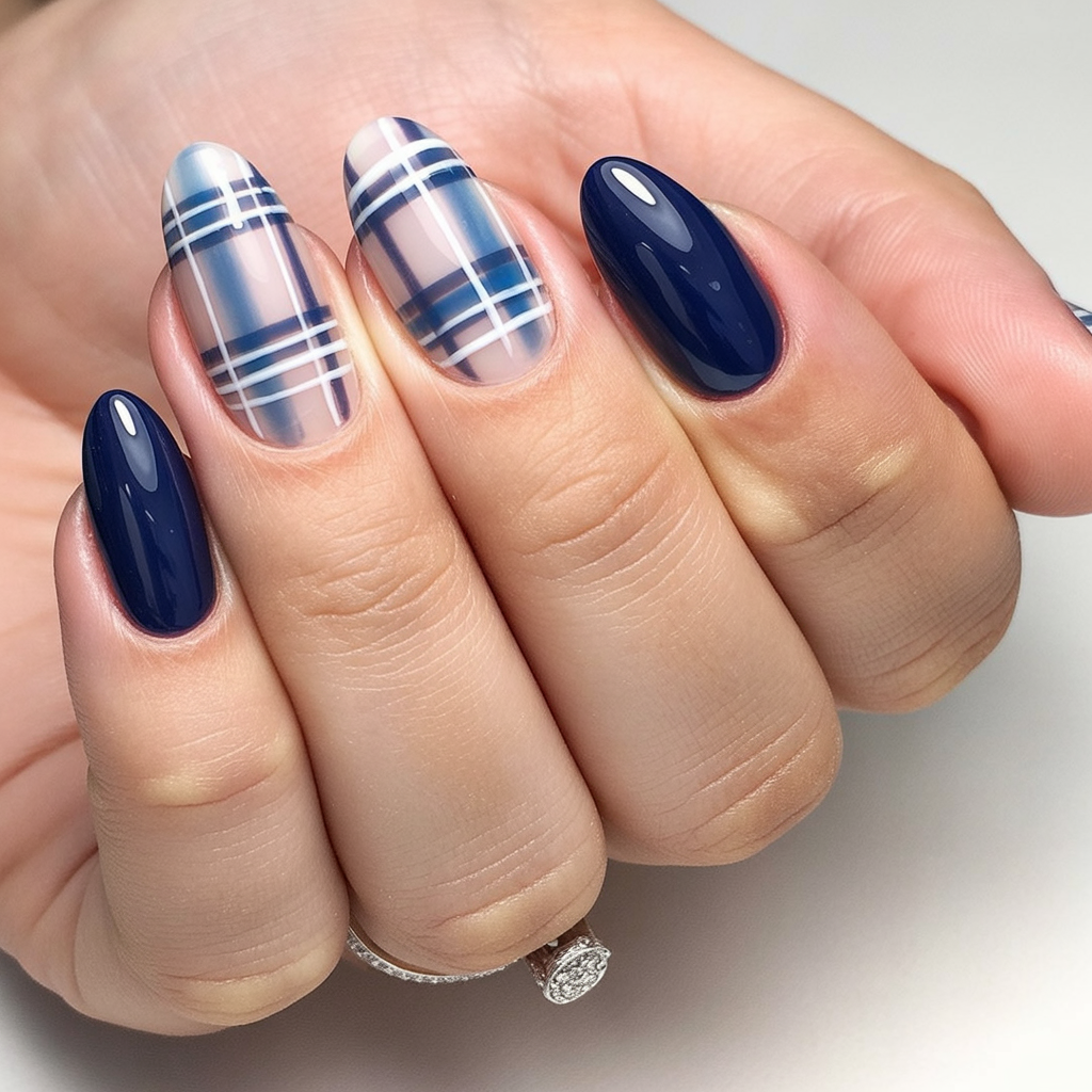 If you are looking for something a bit more shy, then these sheer nude nails together with navy plaid accents are dreamy and modern. The transparency gives softness to the boldly plaid, thus a light airy and elegant design is created. Solid navy pairs it with balance that is both impressive and in contrast with the earlier remark.
