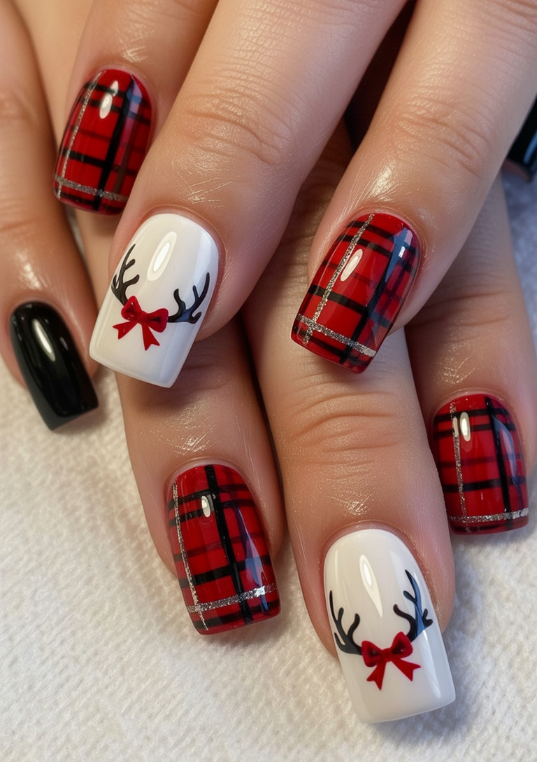 Full of Christmas cheer, fun, and playfulness, these nails feature a gorgeous red plaid pattern that fuses with delightful reindeer antler. The bows that are little red and in shape of a bow-shaped add a lovely whimsical detail that will immediately bring you into the holiday mood. They are cheerful yet not over-the-top.