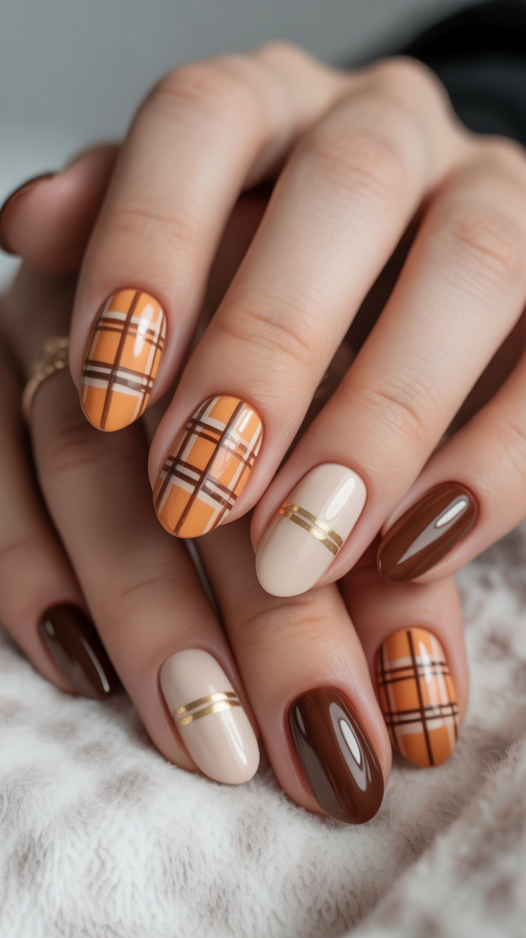 1. Autumn Glow Plaid Nails